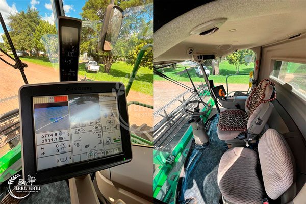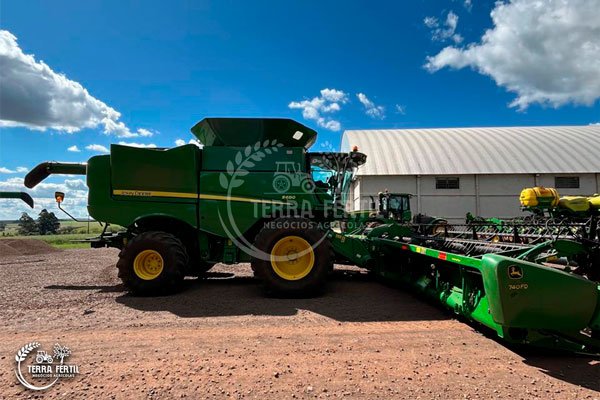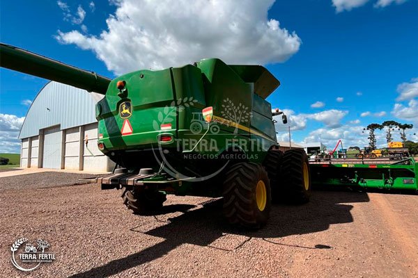Colheitadeira John Deere S680 ano 2014, tração 4×4, plataforma Draper 40 pés, piloto automático. 5.775h motor / 3.912h trilha. Alta capacidade para grandes safras.