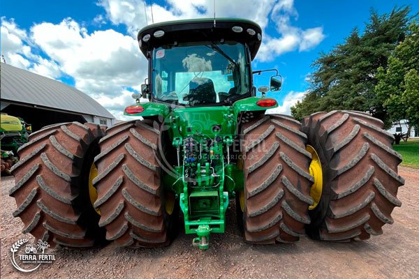 Trator John Deere 8400R ano 2019, 6 VCRs, piloto automático, câmbio E23, suspensão ILS. 4.041 horas. Potência premium para operações pesadas.